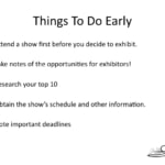 They’re actually fairly polished news dailies, but you do want to look at those things and figure out how can you use this opportunity to your best advantage. All right, some other things to do early, plan your exhibit. What size do you want, how do you want your signage to stand out from everybody else that’s gonna be at the show?