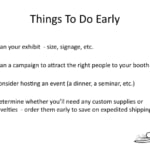Or a contest or game of some kind, the earlier you start thinking about that the better ideas you’re going to come up with. You want to think about the kind of people you want to come to your booth. What can you do that will make them spend 20 minutes out of this very valuable time that they have at the show to make it a point to come to your booth?