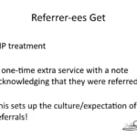 That can be done in a way that’s appropriate. Okay, referrer-ees get presents [LAUGH] well they get VIP treatment basically. So you may want to give them some kind of a gift as well or like a fruit tray or free catering or something like that. A one-time extra service with a note, acknowledging that they were referred.