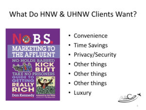A couple of things, and this comes from a couple of sources that are, that we respect a lot. One is Lori White who does a blog on luxury marketing and another is Dan S. Kennedy who wrote the book so to speak, on marketing to the affluent. What do high net worth and ultra high net worth clients want? It’s not necessarily the gold bathroom fixtures, right. In fact, you know there are a lot of myths about high net worth and ultra high net worth people. They are a lot more like, at least the ones that we’ve met and do business with are a whole lot more like Warren Buffet than Kim Kardashian. Wouldn’t you agree?