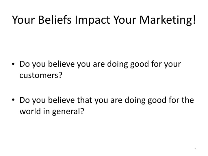 I suppose. Some of your clients have boards to answer to. Some of your clients have other folks that they need to deal with. So let’s talk about this and just be real frank, right? Your beliefs impact your marketing. So if some of this is starting to sink in for you, a lot of the news stories and other kinds of things, they do tend to get under our skin. And we start to feel apologetic, or we start to under play our message, we start to be less aggressive, we start to be a little timid if we feel like people are going to disagree with us. So you really have to be pretty solid in your own beliefs and feel pretty good about what you do for a living, in order to do it effectively. Right?