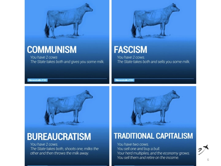 Okay. This is actually a really good cartoon that I’ve seen. And there are all kinds of versions of this. But I like this one because it’s a real simple explanation. And of course there’s a million problems with it. And if you’re listening to this rather than watching, this is the blue cows meme that has been floating around on social media for years. So the first square is a cow in a blue square and it says, “Communism. You have two cows. The state takes both and gives you some milk.” Next blue square, “Fascism, you have two cows. The state takes both and sells you some milk.” Third square, “Bureaucratism, you have two cows. The state takes both, shoots one, milks the other and then throws the milk away.” And the fourth is, “Traditional capitalism.” And that is basically, “You have two cows, you sell one and buy a bull. Your herd multiplies and the economy grows. You sell them and retire on the income.”