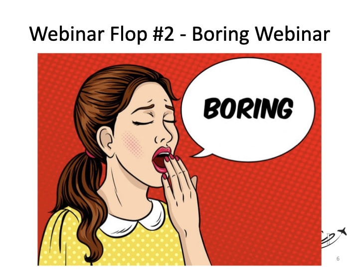 Okay. So we’re going to talk about how to avoid these two kinds of flops. Either not having anyone show up or having it be terribly boring. Okay. So how to avoid attendance flops. Your webinar has to sound like more fun than the Donner Party. Right?