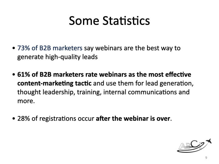 Right, exactly. And we shared these last week as well. 73% of B2B marketers say that webinars are the best way to generate high quality leads. 61% of B2B marketers rate webinars as the most effective content marketing strategy and use them for lead generation, thought leadership training, internal communications, and more. And 28% of registrations occur after the webinar is over.